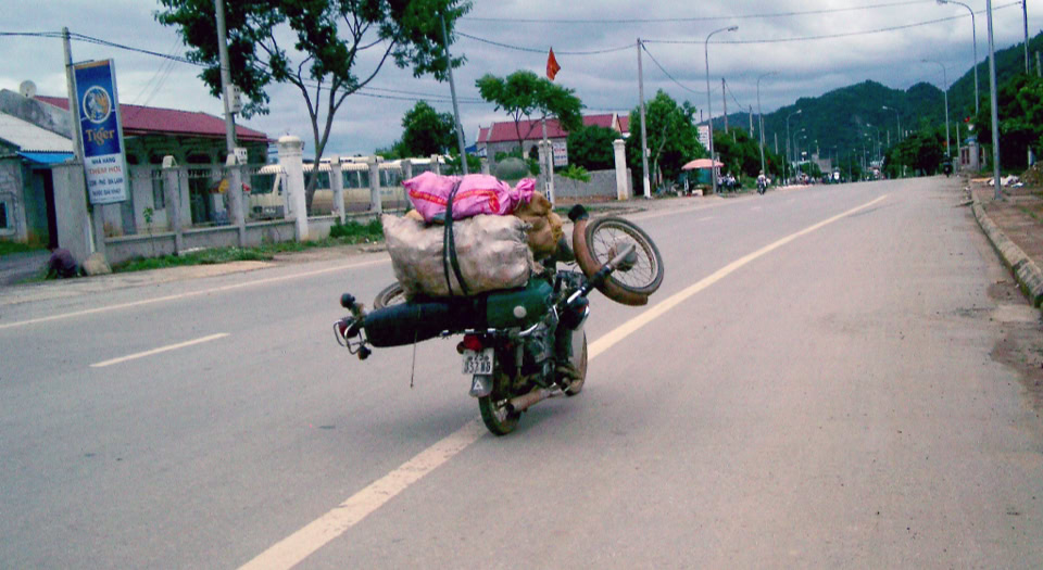 Am nächsten Morgen übernehmen wir unsere Motorräder. Ähm... Motorräder ??? Nee, das kann doch nicht wahr sein? Das sollen unsere Fahrzeuge der nächsten 16 Tage sein? Anscheinend doch. Also, wir übernehmen eine Minsk 125 ccm3, Sportausführung, 7 Ps, mit durch gesessenen Sitzbank und und und. Unser Tourguide Hong meint „Your hate this or you love this Bike“ . Nachdem unsere Fahrzeuge bepackt worden sind, heißt es so schnell wie möglich den Verkehrschaos zu entfliehen. Also die Minsk per Kickstarter anschmeißen und los. Mmhh .. oder doch nicht ??? Als Norbert die Vorderradbremse betätigt fällt sie plötzlich auseinander. Also Moppeds wieder aus und schon haben wir die erste Reparatur und das bei 38°C. Nach einer halben Stunde kann es dann endlich losgehen und so schnell wie möglich Hanoi entfliehen.